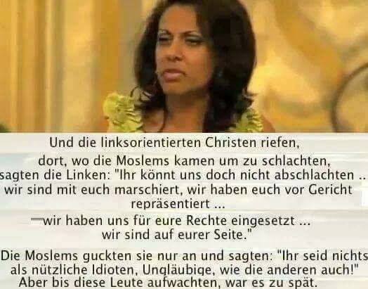Was sie einläuten, ist eine weitere Stärkung des Islam in Deutschland und den anderen westlichen Gesellschaften. Bis dieser dann so stark ist, dass nichtislamische Menschen dasselbe Schicksal erfahren werden wie in Indien (80 Millionen Hindus und 35 Millionen Buddhisten wurden dort von Moslems geschlachtet), in Persien (Auslöschung der Religion Zarathustras, Millionen Perser ermordet), in Byzanz (Millionen Christen nach der Eroberung auf dem heutigen Gebiete der Türkei abgeschlachtet) oder sonst wo, wo der Islam die Herrschaft übernommen hat.