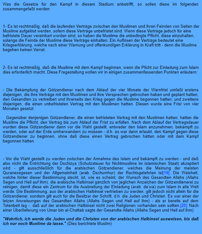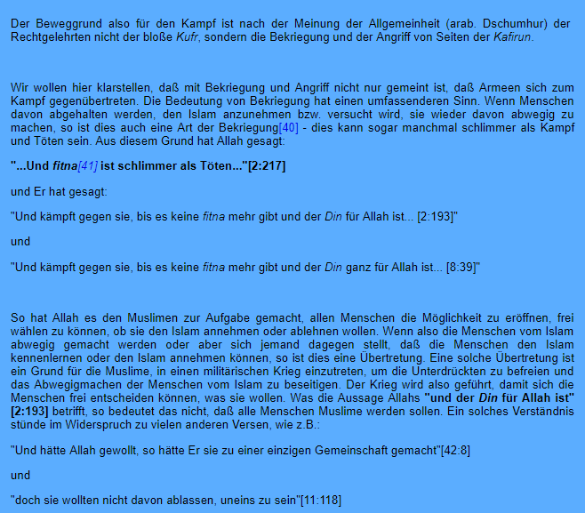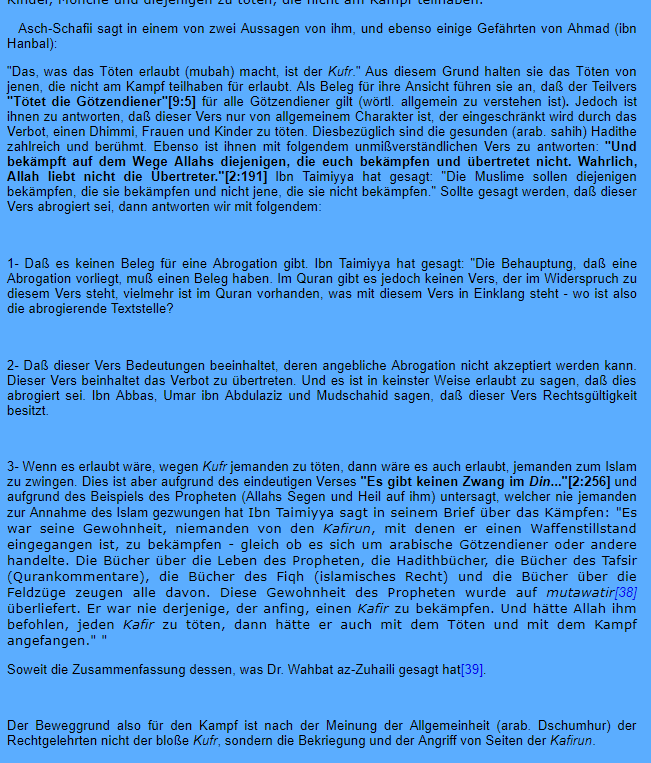Zitat : „Die Götzendiener (Christen/Juden etc) zu töten sei keine Pflicht, sondern lediglich eine Erlaubnis“ Zitatende …