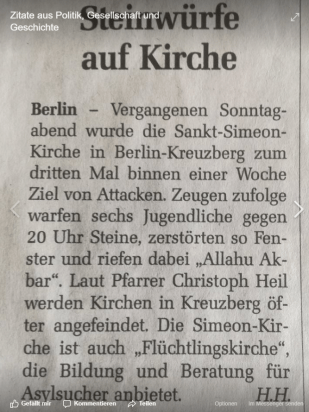 Hierzu assistiert derzeit eine für diese gefährliche islamische Strategie blinde Kirchenführung im Zentralkommitee der Katholiken unter Sternberg ebenso, wie eine scheinbar vom wahren christlichen Glauben abgefallene linkspolitische und multikulturelle Führung der Evangelischen Kirche Deutschlands, die derzeit mit dem Islam – dem größten Feind des Christen- und Judentums – zusammenarbeitet: Die Kirchenführungen und Pfarrer treffen sich dazu z.B. zu gemeinsamen Gebets- und Andachtstreffen mit den Imamen der Moscheeverbände und lassen sich von der momentan friedlichen Taktik der Imame blenden und täuschen.