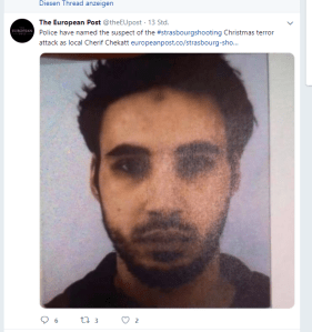 The European Post veröffentlicht ein Foto des mutmaßlichen islamistischen Terrorattentäters Cherif Chekatt – auch auf Twitter