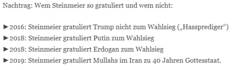 Steinmeier hatte dabei unterwürfigst dem radikal-islamistischen Regime zu seinem vierzigjährigen Bestehen gratuliert, während er – im direkten Vergleich dazu – US-Präsident Donald Trump als , Zitat „Hassprediger“ bezeichnete. Für mich wären Äusserungen dieser Art an sich Grund genug , für einen Rücktritt Steinmeiers vom Amt des Bundespräsidenten….