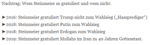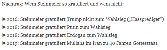 Wer die Freiheit des Andersdenkenden durch Zensurgesetze wie das NetzDG beschneidet, wer Andersdenkende als „Ratten„, „Dunkeldeutschland“, „Pack“ oder „Nazis“ bezeichnet, wer Präsidenten der stärksten Demokratie der Welt als „Hassprediger“ bezeichnet, aber zugleich menschenverachtenden christen- und judenfeindlichen Diktatoren zu ihrem vierzigjährigen Jubiläum gratuliert und wer sich zugleich in seiner eigenen Überheblichkeit erdreistet, mit seinem schmalen Meinungskorridor auch noch ausgerechnet die einzige Bewegung zu sein, die die Demokratie repräsentiert, der hat tatsächlich den karnevalesken Preis als besten Darsteller für Selbstüberheblichkeit verdient.