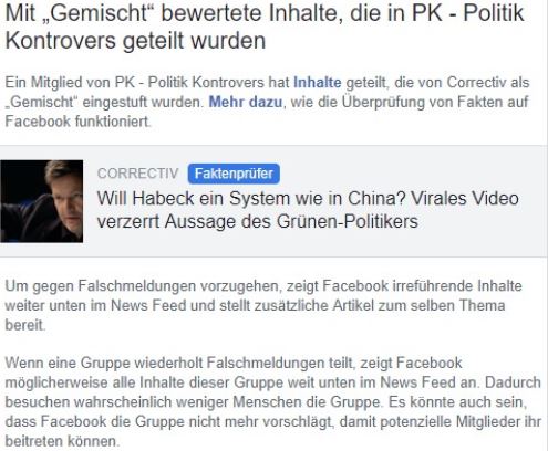 Alternative Sichtweise beispielsweise werden durch quasi staatlich bzw. halbstaatlich finanzierte Meinungskontrolleure in den Sozialen Netzwerken mit einer Art halbstaatlichem Faktencheck unterzogen, die ursprüngliche Meinungsäusserung wird in Kategorien der „Schwere der objektiven Faktenverletzung“ unterteilt und den Administratoren von Netzwerkgruppen wird dann angeraten, solche Meinungsäusserungen zu verhindern, ansonsten drohe eine Ingangsetzung einer Kaskade von Herabstufungen der Reichweitenfähigkeit der Gruppe bzw. Seite – hier am Beispiel der Zensoren von Facebook einmal deutlich gemacht.