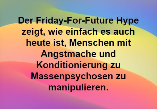 Begleitet wird dieses Instrumentarium von der Ablenkung der öffentlichen Aufmerksamkeit von den drängendensten Problemen wie Kriminalität, Auszehrung der Sozial- und Finanzsysteme durch Massenzuwanderung einerseits und Bankenrettungen andererseits: Durch künstliches aber geschicktes Agendasetting auf den Klimawandel wird ein Teil der Jugend durch eine pseudoreligiöse Klimaverehrung in eine Art Massenpsychose versetzt, sodass diese sich instrumentalisieren und mißbrauchen lassen für dieses Ablenkungsmanöver. Dabei ist den Kindern keinerlei Beschimpfung oder Verurteilung zukommen zu lassen: Diese sind lediglich die Opfer der Manipulation durch dauerhafte Konditionierung in den Medien und im Schulunterricht durch links-grün-sozialistisches Lehrerpersonal.