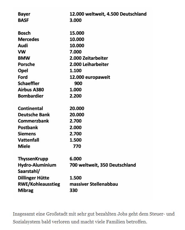 Die Liste bereits angekündigter oder geplanter Entlassungen wird immer länger : Schuld ist eine Kombination aus zu hohen Steuern, zu hohen Sozialbeiträgen, zu teuren Energiepreisen, zu viel Regulierung sowie der angekündigten CO2-Steuer, die nochmal die jetzt schon doppelt so hohen Strompreise Deutschlands im Vergleich zu Frankreich und auch Öl, Gas und Kraftstoffe weiter verteuern wird: