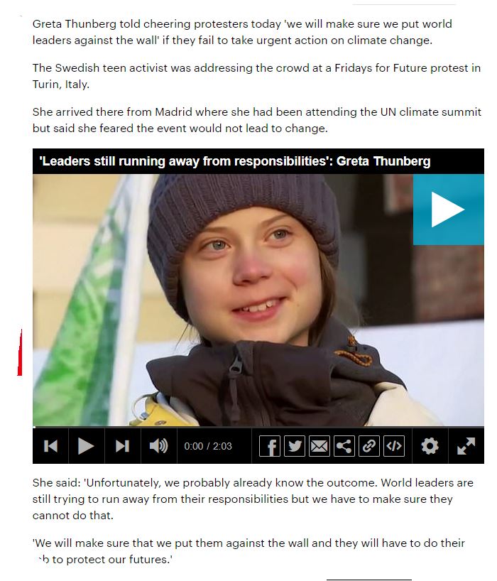Wie die britische Tageszeitung Daily Mail berichtet, hat Greta Thunberg einer grölenden Menge gegenüber die Aussage getätigt, dass „wir sicherstellen werden, Weltpolitiker an die Wand zu stellen“ , wenn sie keine sofortigen Aktionen gegen den Klimawandel durchsetzten.