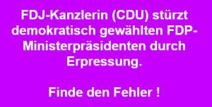 Zuvor hatte die CDU den FDP-Ministerpräsidenten Kemmerich gewählt. Aber dies gefiel der FDJ-Kanzlerin nicht. Schon auf der Pressekonferenz während ihres Staatsbesuchs in Südafrika rief die Dame zum Sturz des demokratisch gewählten Ministerpräsidenten Kemmerich auf. Die Wahl Kemmerichs sei „unverzeihlich“ und müsse rückgängig gemacht werden.
