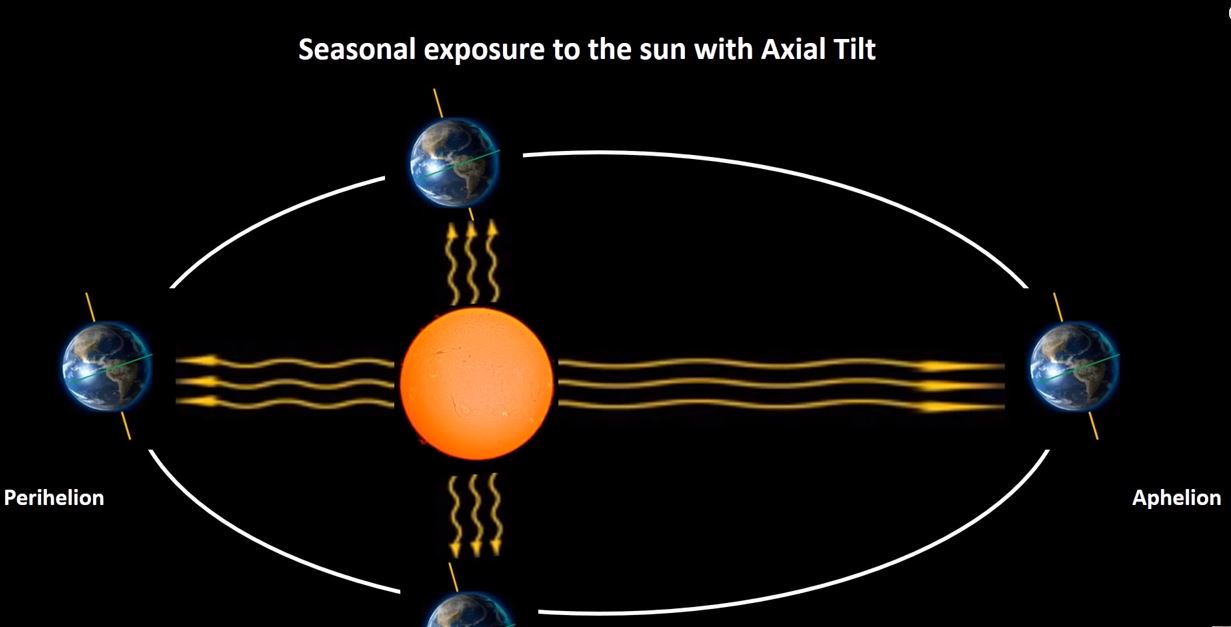 Die Erde war der Sonne am 3. Januar 2019 am nächsten, Periphelion ist also in der nördlichen Hemisphäre im Winter. Der Zeitpunkt der größten Entfernung zur Sonne “Aphelion” war am 4. Juli erreicht, also im Sommer der nördlichen Hemisphäre. Dass die Entfernung zur Sonne nicht mit den Jahreszeiten im Einklang steht, wie man das intuitiv vielleicht erwartet, liegt an der Neigung der Erdachse. Die Neigung beträgt zwischen 21,5 Grad und 24,5 Grad in Bezug auf die Ebene der Umlaufbahn der Erde. Derzeit ist die Erdachse um 23,4 Grad geneigt. Die Neigung hat zur Konsequenz, dass je nach der Position zur Sonne, mehr Sonnenstrahlung auf die Nord- bzw. die Südhalbkugel trifft, und damit ist die Neigung für die Jahreszeiten verantwortlich. Je größer die Neigung, desto extremer die Unterschiede zwischen den Jahreszeiten, je geringer die Neigung, desto ähnlicher sind sich die Jahreszeiten. Zur Zeit wird die Neigung der Erdachse geringer, d.h. die Unterschiede zwischen den Jahreszeiten sollten ebenfalls geringer werden. Um einen Zyklus zu vollenden, also von einer Neigung von 24,5 Grad zu einer Neigung von 21,5 Grad zu gelangen, oder umgekehrt, benötigt die Erde rund 41.000 Jahre.