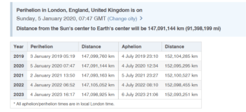 - Perihelion und Aphelion beschreiben die beiden Zeitpunkte, zu denen die Erde der Sonne am nächsten (Perihelion) bzw. am weitesten (Aphelion) von der Sonnen entfernt ist. Die folgende Tabelle gibt die Entfernungen zur Sonne für London an.