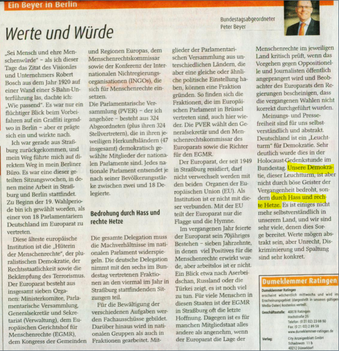 „Die Demokratie ist durch Hass und Hetze bedroht“, so klagt Dr. Peter Beyer, CDU, in seiner gestrigen Dumeklemmer-Kolumne Werte und Würde. Wo er recht hat, da hat er recht. Spontan fällt mir da die Wortschöpfung vom „Bullenschwein“ ein, eine in gewissen Kreisen gängige Bezeichnung für unsere Ordnungshüter. Eine Suchabfrage mit diesem Begriff in Wikipedia ergibt über fünfzigtausend Treffer. Allen voran die berüchtigte, von den bundesdeutschen Behörden tolerierte Plattform Indymedia. Dort finde ich im Eintrag „BULLENSCHWEINE RAUS AUS UNSEREN KIEZEN! Aufruf zu mehr Wut!“ die einleitende Passage: „Menschen, die sich solidarisch mit unserem Haus zeigen wollten, wurden brutal und aggressiv auf dem Dorfplatz von Zivischweinen gejagt und festgenommen; Bullen bewachten AFD-Schmutz mit Hundestaffel vor Antifaschist*innen….. Deutsche Polizist*innen sind Mörder*innen und Faschist*innen“ .
