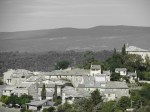 Lavendelfelder in Richtung Südfrankreich fahrend, im Hintergrund die Alpenausläufer