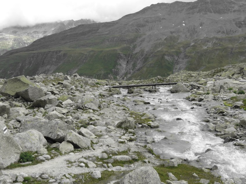 Gletscherwasser mit Fussgängerbrücke : Grimselpass : Schweiz