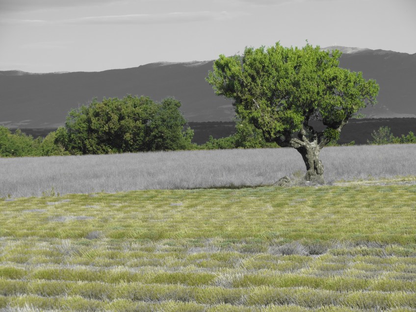 Lavendelfelder in Richtung Südfrankreich fahrend, im Hintergrund die Alpenausläufer