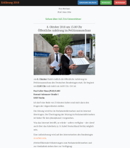 Am 8. Oktober findet die öffentliche Anhörung im Petitionsausschuss des Deutschen Bundestags , Paul-Löbe-Haus, Konrad-Adenauer-Str. 1 statt. Sie beginnt um 13.00 Uhr. Vera Lengsfeld kann dann in einer 5 minütigen Rede die Petition vorstellen und stellt sich dann den Fragen der Abgeordneten.